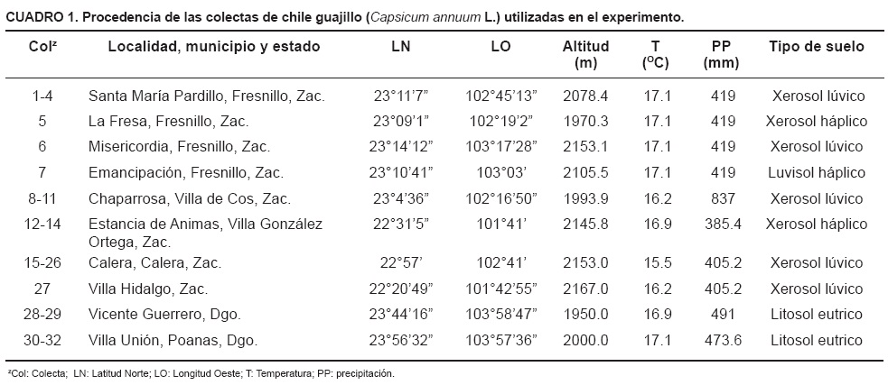 El material vegetal consistió de semillas provenientes de frutos con buenas características físicas y sanitarias de 32 colectas de chile guajillo procedentes de diferentes municipios de los estados de Zacatecas y Durango (Cuadro 1). La semilla fue sembrada en charolas germinadoras de poliestireno con 200 cavidades, llenas con sustrato húmedo compuesto por la mezcla de perlita y musgo (2:1 v/v); manualmente se colocaron dos semillas en cada cavidad a una profundidad de 0.5 cm y después de la emergencia se dejó una plántula por cavidad. Las plántulas fueron regadas con agua potable en los primeros 15 días y posteriormente con una solución nutritiva que contenía, en mg·L1, los elementos nutritivos siguientes: N=100, P=30, K=150, Ca=125, Mg=30, S=110, Fe=1.5, Mn=0.5, Cu =0.05, B=0.5, y Zn=0.05 hasta que se realizó el trasplante en campo (50 días después de la emergencia (dde). Previamente el terreno se barbechó y rastreó; se surcó a 90 cm de separación, se colocó la cintilla de riego con goteros a cada 40 cm de separación y gasto de 2 litros h1, y se acolchó con plástico de color negroplata.