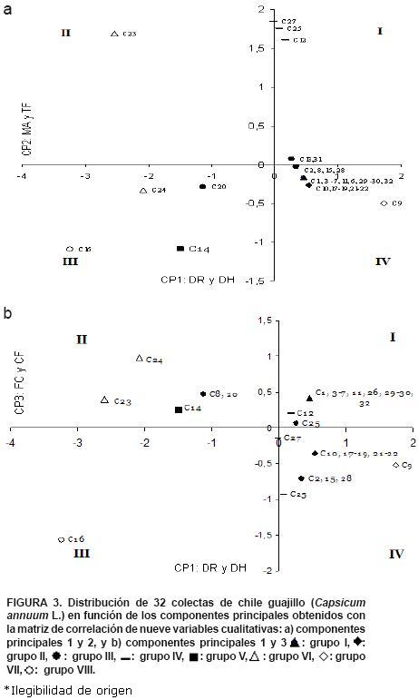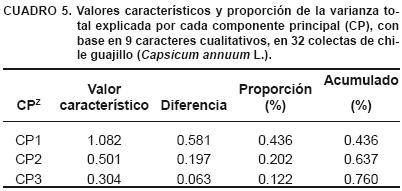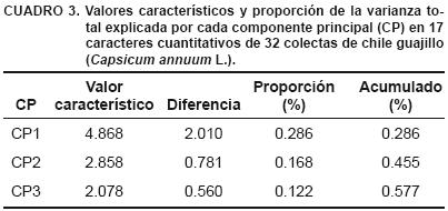 El ACP indicó que los primeros tres componentes explicaron 57.7 % de la variación total existente en las colectas estudias; el componente principal 1 (CP1) explicó 28.6 %, el CP2 lo hizo en 16.8% y el CP3 en 12.2 % (Cuadro 3).