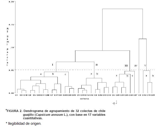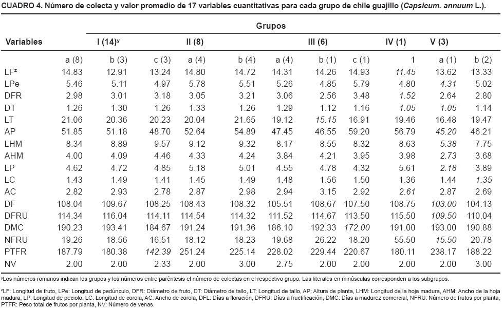 Los cinco grupos generados a través de ACJ fueron subdivididos (Figura 2; Cuadro 4) con el propósito de definir con mayor precisión a cada grupo. Las colectas correspondientes al subgrupo I b fueron más tardías ya que requirieron 110, 116 y 193 días para alcanzar la floración (DFL), fructificación (DFRU) y madurez comercial (DMC), respectivamente. Las colectas del subgrupo I c mostraron mayor longitud y anchura de la hoja, en contraste con las colectas del subgrupo V a que tuvieron valores más bajos en esas variables.
