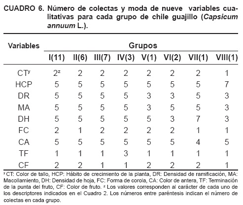 De acuerdo con el ACJ (Figura 4), se formaron ocho grupos, resultado similar al reportado por Chávez y Castillo (1999) en un estudio de variabilidad en 84 poblaciones nativas de chile manzano, en el que consideraron 16 variables de tipo cualitativo y cuantitativo de acuerdo con descriptores para Capsicum del IPGRI; las colectas involucradas en ese estudio conformaron nueve grupos.