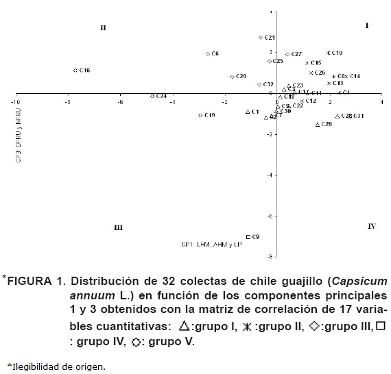 De acuerdo con los CP1 y CP2 (Figura 1), la dispersión de las colectas permitió la formación de cinco grupos (G). En el GI se encuentra el mayor número de las colectas, mismas que se distribuyeron en los cuatro cuadrantes, lo que indica que existe variación, principalmente en longitud y anchura de la hoja madura (LHM, AHM), longitud de pecíolo (LP), diámetro de fruto (DFR) y número de frutos por planta (NFRU), variables que son útiles en trabajos de mejoramiento genético. Al respecto, Qaryouti et al. (2003), señalan que el peso, longitud, curvatura y pungencia del fruto son caracteres ampliamente usados en el proceso de selección de Capsicum annuum debido a la variación que éstos muestran.