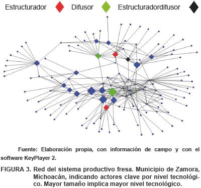 Los agroempresarios freseros de Zamora, Mich., entrevistados tuvieron en promedio un rendimiento de 26.44 t·ha1, que es inferior en un 20 % a la media del estado. También tuvieron un ingreso por hectárea de $ 110,677.84, pero un costo de producción de $ 142, 641.00, a pesar de tener un alto índice de adopción de innovaciones, de 55.56 %, además de que uno de los tres nodos con mayor nivel tecnológico (ER19) se encuentre en la terna de los actores clave difusores. Cabe mencionar que la diferencia entre el ingreso por hectárea y los costos de producción, es decir, las pérdidas económicas de los agroempresarios freseros, son asumidas mediante tres vías: a) proveedores de servicios financieros varios, incluidos los agiotistas, b) uso "productivo" de las remesas y c) estrategias de supervivencia de la unidad de producción y del agroempresario.
