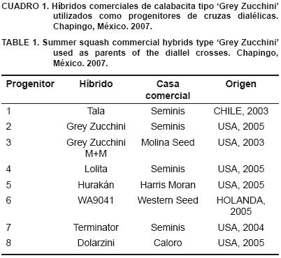 Se emplearon ocho híbridos de calabacita tipo 'Grey Zucchini' de diferentes casas comerciales (Cuadro 1). Con ellos se obtuvieron 56 cruzas (28 directas y 28 recíprocas) posibles en la primavera de 2006. De cada cruza se aseguró al menos la polinización de 10 plantas del progenitor femenino.