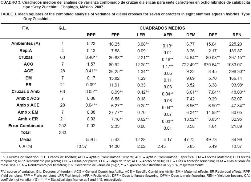 Los cuadrados medios combinados por ambientes y los niveles de significancia para los caracteres: rendimiento por planta (RPP, g), número de frutos por planta (FPP), largo de fruto (LFR, cm), ancho de fruto (AFR, cm), días a floración masculina (DFM), días a floración femenina (DFF) y rendimiento de calabacita para verdura por hectárea (REN, t·ha1) con el método I modelo II de Griffing, que se presentan en el Cuadro 3, indican que hubo diferencias altamente significativas (P < 0.01) entre cruzas para todos los caracteres evaluados, lo cual se puede atribuir a la divergencia genética que presentan los progenitores por su diversidad de origen. Esto hace posible la identificación de cruzas precoces y tardías, con frutos más grandes (largos y anchos) y sobre todo con rendimiento contrastante. La contribución a la varianza del rendimiento por planta atribuible a las cruzas, estuvo constituida por 42% para los efectos de ACG, 45% no aditivos (ACE), 5% efectos maternos y 8% efectos recíprocos. Los resultados con respecto a los efectos de ACG y ACE, indican que tanto los efectos aditivos como los no aditivos contribuyen de manera equilibrada en las cruzas para rendimiento. Al respecto, Gutiérrez et al. (2002) encontró en maíz que a medida que la divergencia genética de los materiales se incrementa, aumenta también la diferencia entre los valores de Aptitud Combinatoria, ya sea para ACG o para ACE; o bien para los dos tipos de acción génica.