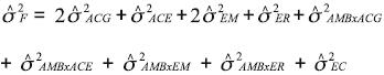 2F) es la varianza fenotípica, la cual se obtuvo a partir de los componentes de varianza estimadas (σ2ACG,σ2ACE,σ2EM, σ1ER,σ1AMBxACG, σ2AMBxACE, σ2AMBxEM, σ2AMBxER, σ2EC) por el modelo del análisis combinado de Montesinos et al. (2007) de la siguiente forma: