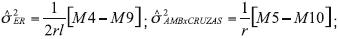 En la estimación de los componentes de varianza con el Método I Modelo II de Griffing (efectos aleatorios en el caso en que se considere que los híbridos son una muestra de una población de híbridos), se asumió que los progenitores son híbridos de cruza simple formados por líneas no emparentadas y con coeficientes de endogamia igual a la unidad, por lo que los componentes de varianza de aptitud combinatoria general (σ2g) y de aptitud combinatoria específica (σ2s) de la población de referencia como factores de efectos aleatorios, tienen las siguientes equivalencias en términos de covarianza [Cov] de familias de medios hermanos (MH) y hermanos completos (HC) (Cockerham, 1954 y Kempthorne, 1957):