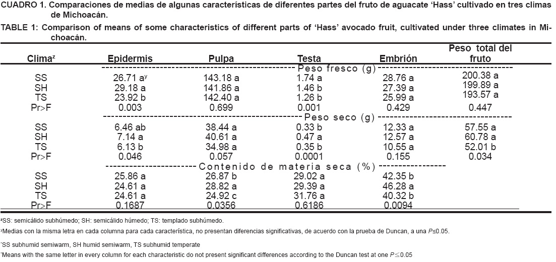 El clima no afectó el peso fresco total del fruto de aguacate 'Hass', aunque la testa tuvo mayor peso en el clima semicálido húmedo, pero el peso seco y contenido de materia seca fueron menores en el clima templado subhúmedo, respecto al semicálido húmedo. La condición de humedad del suelo no afectó el peso fresco o seco de ninguna de las partes, pero sí la época de floración.