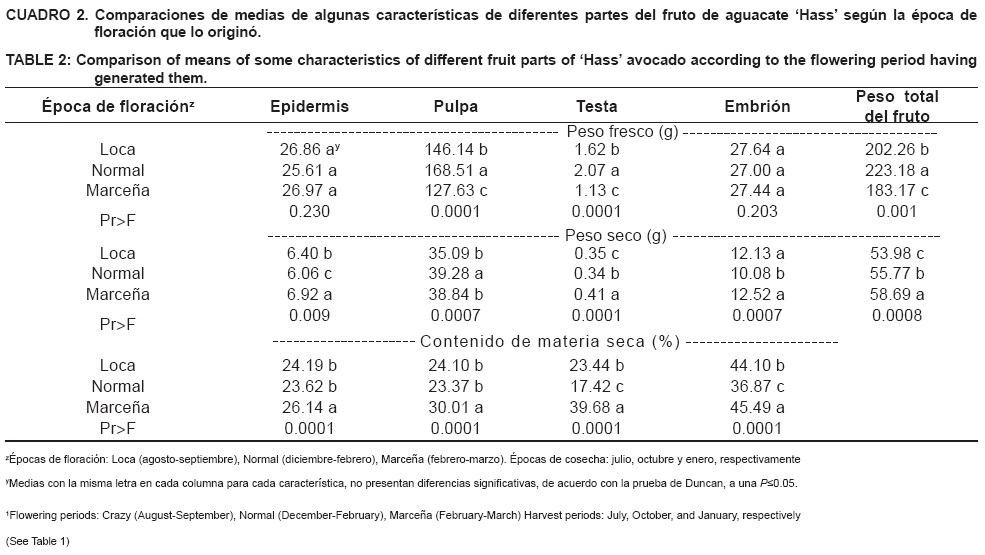 Los pesos fresco y seco del fruto cosechado mostraron variaciones debidas al clima (Cuadro 1) y época de floración que originó al fruto (Cuadro 2). De estos factores, la época de floración (loca, normal o marceña) fue la que tuvo mayor diferencia significativa en el peso fresco total del fruto, así como el de la pulpa y testa, siendo mayor en frutos de la floración normal (Cuadro 2). En general, el peso seco del fruto y sus partes fue mayor en frutos de la floración marceña. Respecto al contenido de materia seca (evaluada de manera independiente para cada estructura) siempre fue mayor en frutos de la floración marceña (Cuadro 2). La condición de humedad no afectó significativamente ninguna de las características físicas del fruto evaluadas (Cuadro 3).