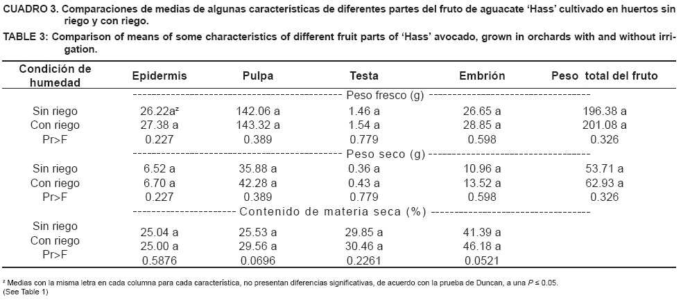 La condición de humedad del suelo no afectó el peso fresco o seco del fruto o sus partes, ni el contenido de materia seca. Esto coincidió con lo encontrado por Michelakis et al. (1993), quienes encontraron que no hubo efecto del riego a 0.3, 0.6 y 0.9 de la evaporación (según tanque tipo "A") sobre el contenido de materia seca del fruto de aguacate 'Fuerte'.