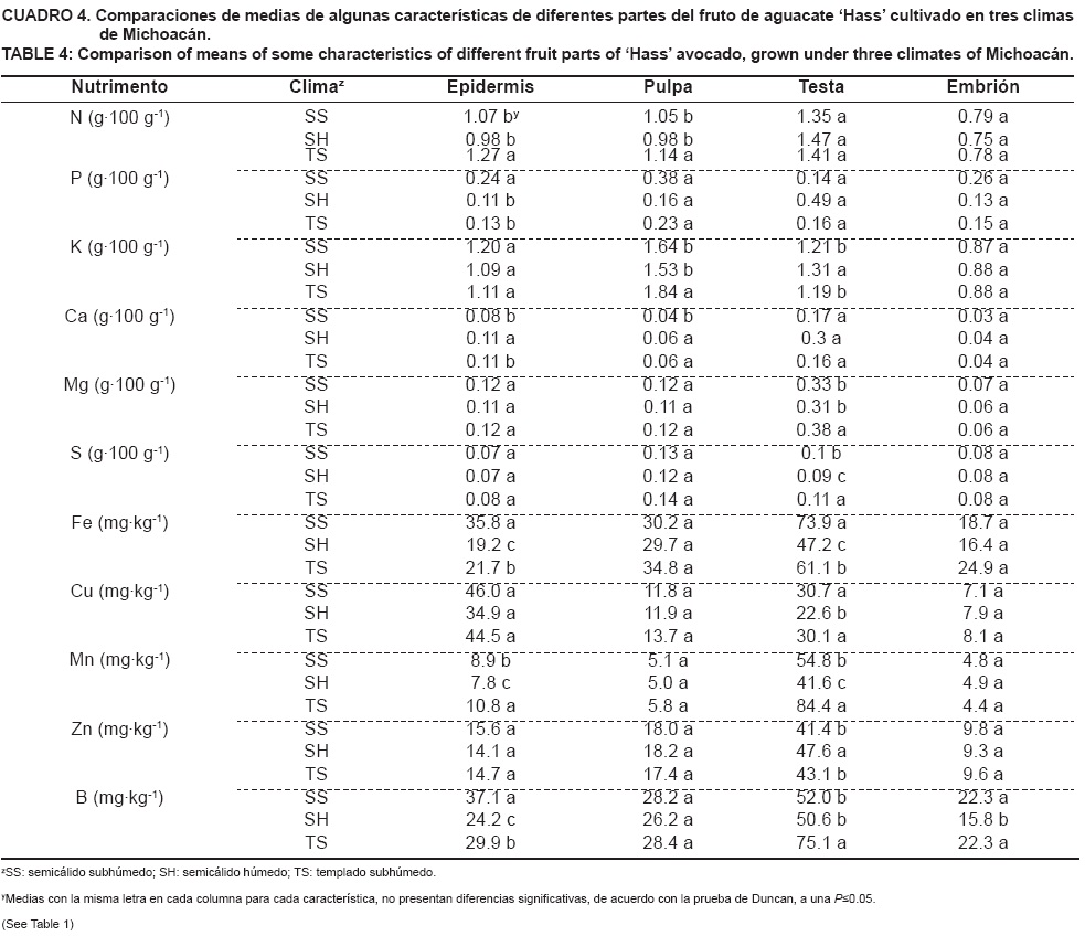 De los tres climas incluidos en este estudio, en el templado subhúmedo [C(w2)(w)] se registraron los mayores contenidos de N y Mn en la epidermis, de N, P, K, Ca y Mg en la pulpa, de Mg, S, Cu y Mn en la testa, así como de B en la testa y el embrión. Lo anterior mostró que el clima TS favoreció una mejor composición nutrimental del fruto. En Michoacán, este clima presenta un buen potencial productivo (Anguiano et al., 2006) y actualmente presenta la mayor tasa de establecimiento de huertos de 'Hass' lo que a futuro pudiera resultar en una mejor composición nutrimental del fruto.