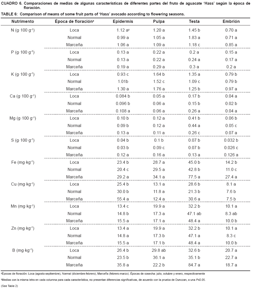 La composición nutrimental de las partes del fruto fue influida por la época de floración. Los frutos originados por la floración marceña tuvieron mayores concentraciones de nutrimentos para 20 de los 44 casos analizados, comparada con las floraciones Loca y normal (6 y 2 casos, respectivamente). La epidermis presentó las concentraciones más elevadas de K, Ca, Mg, S, Fe, Cu, Mn y B. En el caso de la pulpa, se obtuvieron los valores más altos de K y S; en la testa, de Ca, S, Fe, Cu, Mn y B, y para el embrión, de K, Ca, Mg, S y Fe (Cuadro 6).