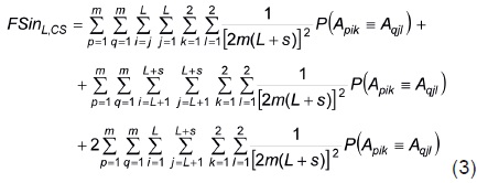 La determinación de FSinL'CS, de acuerdo con Sahagún et al. (2005), se basó en la expresión que resulta de la sustitución del genotipo ApikAqjl del arreglo genotípico del sintético (Ecuación 2) por la coancestría entre los dos individuos que aportan sendos genes, Apik y Aqjl. Esta coancestría es la probabilidad (P) de que Apik y Aqjl sean idénticos por descendencia (≡) [P(Apik = Aqj)].