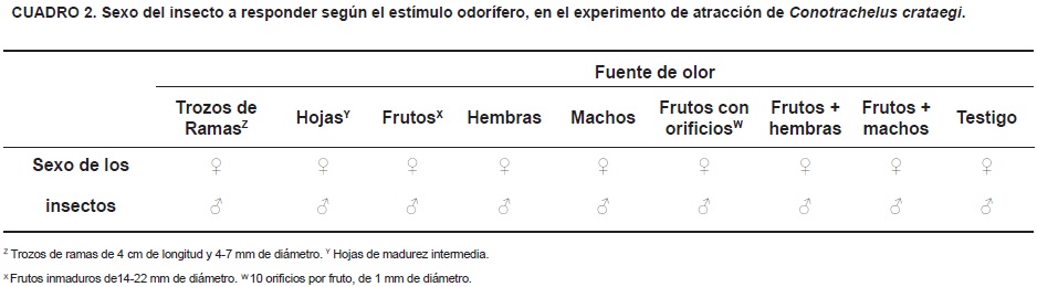 Los resultados del experimento indican que los adultos de C. crataegi son estimulados por compuestos volátiles liberados por los tejocotes, de igual manera que otras especies de curculiónidos, como el picudo del ciruelo (Butkewich et al., 1987; Leskey y Prokopy, 2000 y 2001) y el picudo del nogal, Curculio Caryae (Horn) (Collins et al., 1991), que son atraídos por los olores de sus frutos hospederos. Por lo tanto, es posible que los volátiles de los frutos del tejocote sirvan para identificar compuestos atrayentes de adultos de C. crataegi, que podrían utilizarse en el monitoreo de este insecto.