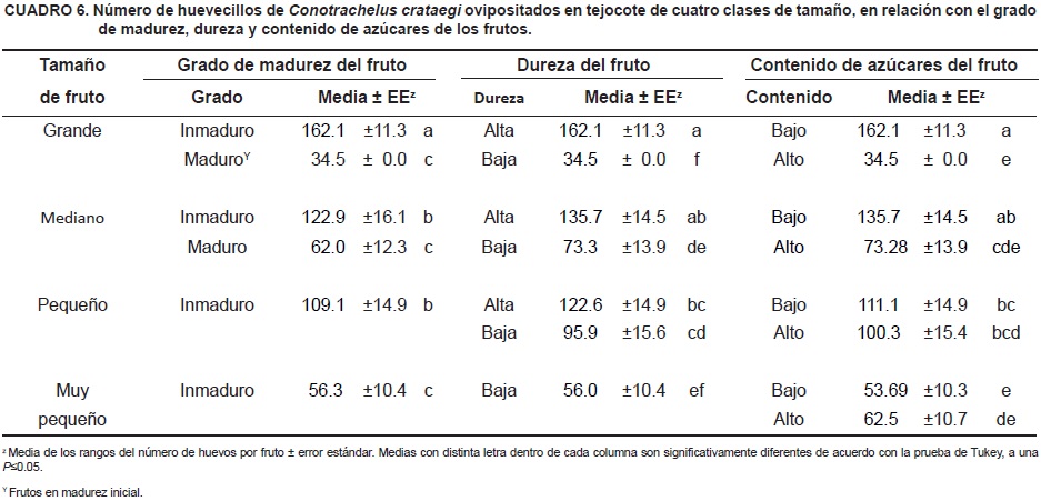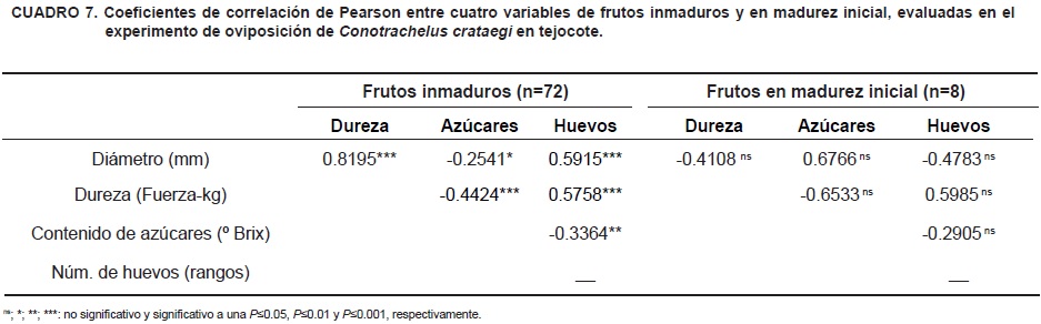 En todas las variables, las diferencias en la preferencia de oviposición del picudo se presentaron solamente en frutos medianos y grandes, lo que puede atribuirse a la especie de tejocote, y al tamaño y grado de madurez del fruto. El análisis de correlación reafirma la influencia de los dos últimos factores (Cuadro 7).