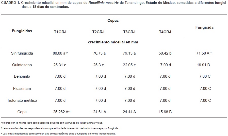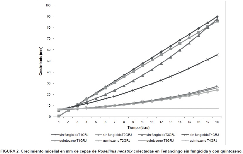 Los análisis de datos en las cepas T1GRJ, T2GRJ, T3GRJ y T4GRJ, mostraron diferencias estadísticas significativas (P<0.05) para los casos de cepas, fungicidas y la interacción cepa por fungicida (Cuadro 1). Los tratamientos sin fungicida presentaron el mayor crecimiento micelial 18 días después de su siembra, seguido por los tratamientos con quintozeno en las cepas T1GRJ, T2GRJ y T3GRJ, ya que este fungicida sólo retrasó el crecimiento micelial por alrededor de tres días (Figura 2), mientras que la cepa T4GRJ fue completamente sensible al no mostrar crecimiento micelial; con los fungicidas tiofanato metílico, fluazinam y benomilo el crecimiento micelial de Rosellinia necatrix fue nulo.