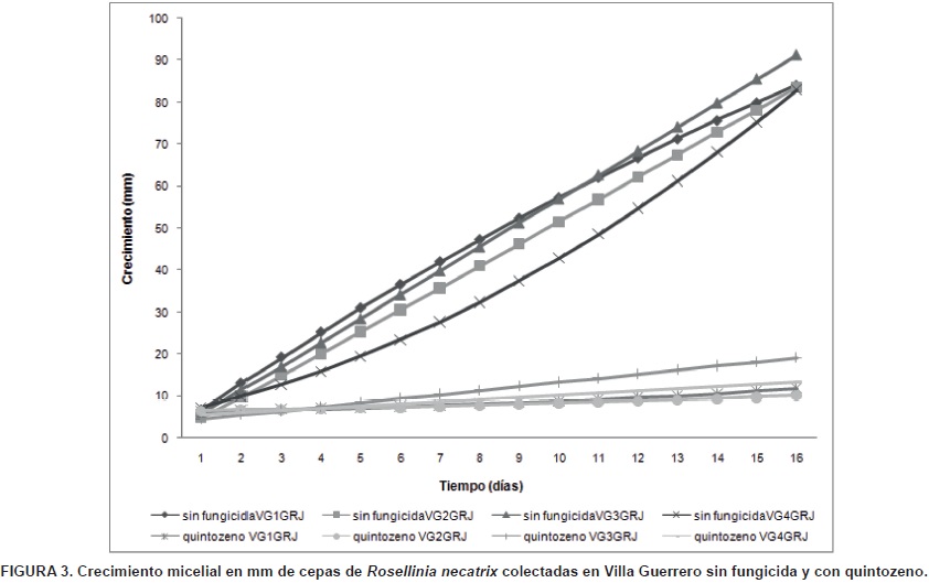 De las cepas obtenidas se evaluó la sensibilidad in vitro a fungicidas comerciales con los siguientes ingredientes activos: quintozeno, benomilo, fluazinam y tiofanato metílico. Las dosis determinadas con base en la recomendación del fabricante, fueron las siguientes: 1 g·L1 para quintozeno, 0.6 g·L1 para benomilo, 0.5 ml·L1 para fluazinam y 0.6 g·L1 para tiofanato metílico. Los fungicidas fueron adicionados al medio de cultivo jugo V8 que fue vertido en cajas Petri de 8 cm de diámetro; una vez solidificado, se colocó en el centro de la caja una rodaja de 7 mm de diámetro de medio que contenía a R. necatrix; como testigos absolutos se sembraron las mismas cepas, pero sin fungicidas. Las siembras se mantuvieron a 2426 °C en obscuridad, y cada 24 h se registró el crecimiento micelial del hongo utilizando un calibrador digital. Las mediciones se dieron por terminadas cuando las cajas de los testigos absolutos fueron completamente cubiertas por el crecimiento micelial.