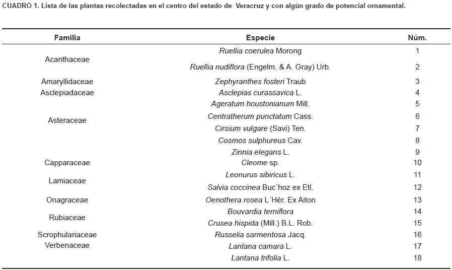 La zona central del estado de Veracruz posee una gran biodiversidad de plantas vasculares, dentro de las cuales destacan especies herbáceas con potencial ornamental. De las 18 especies recolectadas, se determinó que un tercio de ellas presentan un alto potencial ornamental y dos tercios mediano potencial.