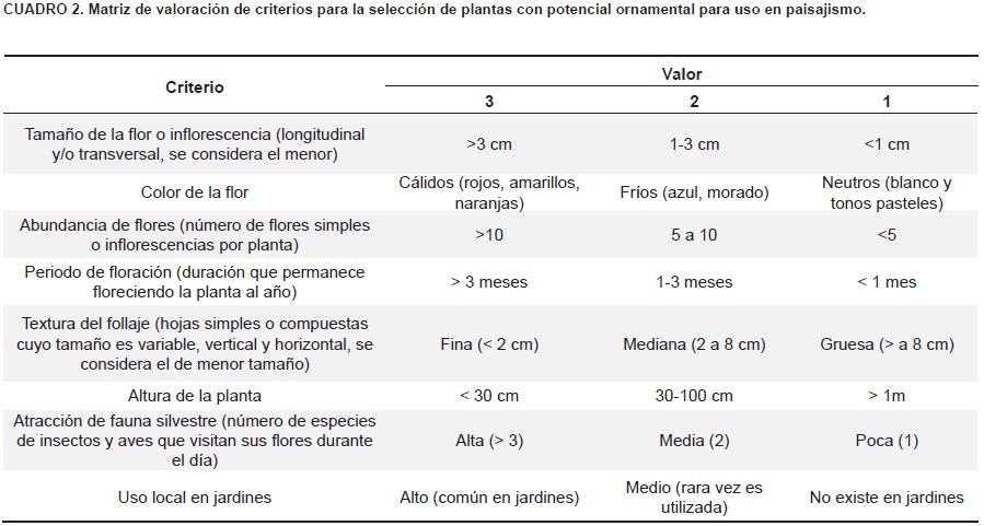 Se construyó un instrumento de valoración del potencial ornamental y paisajístico de las especies recolectadas con base en criterios de selección sugeridos por Sánchez (2005), que considera aspectos ambientales (adaptación al clima, requerimientos edafológicos, resistencia a plagas y enfermedades, necesidades de sol o sombra) y paisajísticos (porte y forma, tasa de crecimiento y desarrollo, textura, color y estacionalidad). Por su parte Morrison (2004) considera el aroma, tamaño del tallo, color, número de hojas y de flores, forma, textura y fenología como criterios. Farina et al. (2007), Hitchmough y Woudstra (1999), y Hitchmough et al. (2004) señalan la textura del follaje, la forma y color de la flor y la fenología de la planta como aquellos criterios de mayor importancia. De esta forma y considerando los anteriores, se definieron ocho criterios de calificación, cada uno con tres posibles calificaciones, los cuales fueron integrados en una matriz de valoración (Cuadro 2). A partir de la suma de calificaciones totales, se definieron tres categorías de potencialidad: alta (1924), media (1318) y baja (812).