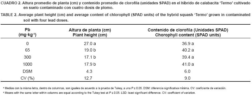 En altura de planta el testigo superó estadísticamente (P ≤ 0.05) a las de los tres tratamientos restantes, cuyas medias no presentaron diferencias estadísticas (Cuadro 2). Esta variable se comportó como se esperaba, de acuerdo con lo que reporta Alloway (1994) al referirse a los síntomas de toxicidad por plomo.