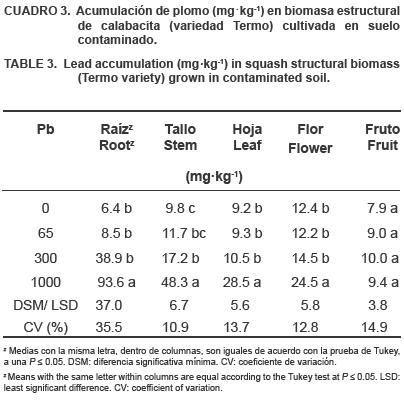En estructuras comestibles, la flor presentó una mayor acumulación de plomo que el fruto tierno. A la concentración de 65 ppm de Pb y en el control, la flor fue la estructura que más plomo acumuló y, a las mismas concentraciones, la acumulación del metal en flor y en fruto fue mayor que en raíz. Las diferentes estructuras acumularon más plomo conforme aumentó la concentración del metal en el suelo.