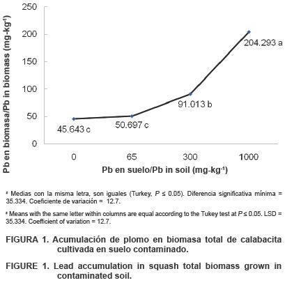 La acumulación de plomo en la biomasa total presentó diferencias significativas (P ≤ 0.05, Figura 1) entre las medias de los tratamientos, y una tendencia a una mayor acumulación del metal en la biomasa total conforme aumentó la concentración del mismo en el suelo.