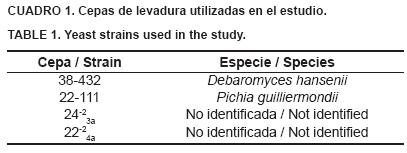 Se utilizaron cuatro cepas de levaduras aisladas de manzanas de la región productora de Querétaro, México, que en estudios previos exhibieron los mejores comportamientos como antagonistas. Dos de ellas fueron identificadas a nivel de especie por el método Biolog: 38432 y 22111 (Soto y Martínez, 2009) y 2423a 2224a (resultados no publicados) (Cuadro 1). Asimismo, como patógeno a inhibir se utilizó la cepa del hongo P. expansum Link CFNL2016, aislada de manzana 'Golden Delicious' y seleccionada por su elevada virulencia (Sánchez et al., 2008).