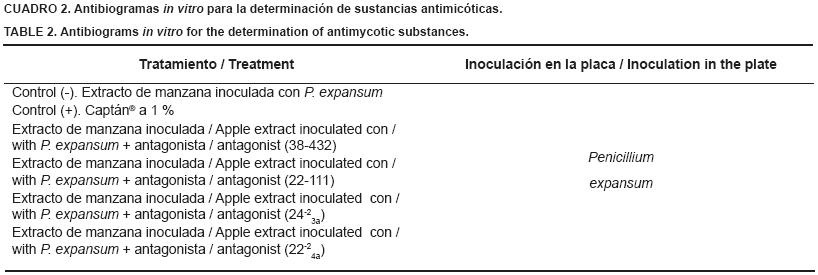 Para la segunda parte del ensayo se realizaron antibiogramas in vitro, vertiendo por separado 5 µl de cada uno de los extractos obtenidos en cada uno de tres discos de papel filtro Whatman estériles de 1 cm de diámetro colocados sobre placas de PDA. En el centro de cada placa se inoculó P. expansum (200 esporas), y las placas se incubaron a 25 °C durante 10 días. Además, se utilizó el fungicida Captán® (ingrediente activo: N(triclorometiltio) ciclohex4ene1,2dicarboximida) a 1 % como control positivo. Así, se evaluaron seis tratamientos (Cuadro 2). La variable evaluada fue la longitud del halo de inhibición. Se realizó un análisis de varianza cuando éste se presentó.