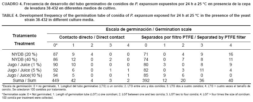 Al incubar las esporas del patógeno en contacto directo con la cepa de levadura 38 432 (Debaromyces hansenii), su germinación se redujo considerablemente (a 6, 8 y 10 % en jugo a 10, 5 y 1 %, respectivamente, y a 13 y 14 % en medio NYDB a 20 y 40 %, respectivamente), por lo que se obtuvo un bajo y negativo coeficiente de correlación con el testigo (r = 0.280). Un comportamiento similar al anterior se observó cuando el antagonista fue separado del patógeno por un filtro semipermeable, donde la germinación de los conidios contenidos en NYDB 20 % se inhibió en más de 71 %; en NYDB 40 %, en más del 74 %, y en jugo de manzana, en más de 80 % (Cuadro 4). El coeficiente de correlación obtenido entre las frecuencias de clase de los índices de germinación para ambos tratamientos (con filtro y sin filtro) fue muy elevado (r = 0.989). La presencia del filtro no impide la inhibición de la germinación de las esporas, lo que implica un modo de acción de la levadura por competencia por nutrientes.