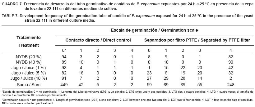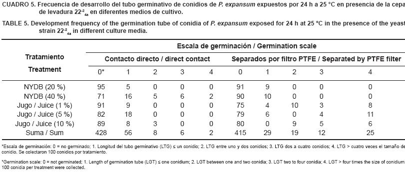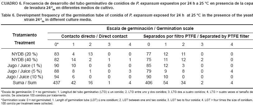 En el caso de la levadura 2224a, debido a que estuvo en contacto célulacélula con el patógeno, la germinación de este último se inhibió en 95 % y en 71 % en NYDB 20 % y NYDB 40 %, respectivamente, y en 91, 82 y 89 % en jugo de manzana a 1, 5 y 10 %, respectivamente (r = 0.298, con relación al testigo). Al ser separada del hongo por el filtro, la germinación del hongo continuó inhibiéndose significativamente. Así, los conidios en NYDB 20 y 40 % se inhibieron en 91 y 90 %, respectivamente, y en jugo de manzana a 1, 5 y 10 %, en 75, 79 y 80 %, respectivamente (Cuadro 5). El coeficiente de correlación (r = 0.995) entre ambos tratamientos (con y sin filtro) es muy similar al obtenido con la cepa 38432, y también resultan compatibles con el modo de acción por competencia por nutrientes con esta levadura.