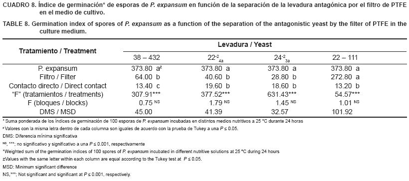 Finalmente, el análisis de las sumas de los índices de germinación (Cuadro 8) confirma los resultados arriba expuestos. Para las levaduras 38432, 2224a y 2423a el índice de germinación de P. expansum obtenido en presencia de la levadura (con y sin filtro) es significativamente inferior (P ≤ 0.05) al que se obtiene incubando solas las esporas del patógeno, lo que es compatible con un modo de acción por competencia por nutrientes y/o espacio. En el caso de la levadura 22111, cuando se separa del patógeno por medio del filtro, se obtiene un índice de germinación estadísticamente igual al observado en el patógeno sin el antagonista, lo cual es compatible con una interacción directa entre éstos. En el mismo cuadro, la no significancia entre bloques en todas las levaduras muestra que el medio de cultivo no afectó la germinación de las esporas.