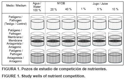 Se realizaron tres tratamientos para cada antagonista (Janisiewicz et al., 2000): 1) Testigo P. expansum (patógeno) sin levadura; 2) El patógeno y el antagonista separados por un filtro semipermeable hidrofílico de politetrafluoroetileno (PTFE), y 3) El patógeno y el antagonista sin filtro. Para cada tratamiento se utilizaron pozos de 1 ml incluidos en microplacas de poliestireno, que contenían distintos medios: agua, NYDA 20 y 40 % y jugo de manzana 1, 5 y 10 % (Figura 1). Las concentraciones del inóculo en el medio se ajustaron a 1 x 104 ml1 para el patógeno (200 esporas) y de 1 x 107 ml1 para el antagonista (25,000 células).