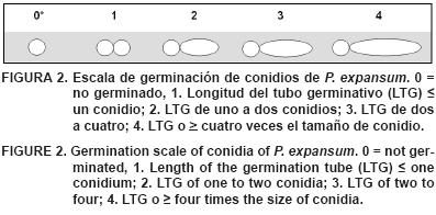 Las microplacas se incubaron a 25 °C durante 24 horas. Se evaluó el índice de germinación desde 0 (espora no germinada) hasta 4 (tubo germinativo ≥ cuatro veces el diámetro de la espora) (Figura 2). Se consideraron 100 esporas por tratamiento en tres diferentes campos del microscopio. Se llevaron a cabo análisis de correlación simple por pares entre las frecuencias de clase de los índices de germinación del hongo, obtenidos cuando éste se encontraba en contacto directo con la levadura y cuando se encontraba separado por la membrana, así como de éstos con el testigo. Además, se llevó a cabo un análisis de varianza para cada antagonista, tomando como variable la suma ponderada de los índices de germinación de las esporas en un diseño experimental de bloques al azar y considerando como bloques los cinco medios empleados. Se utilizó el Programa estadístico STATGRAPHICS Centurion XVI.I (Statpoint Technologies, Inc. 2010) (Castaño y Domínguez, 2010).