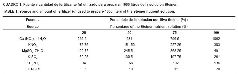 Para la aplicación de los tratamientos se usaron cuatro tanques con capacidad de 1000 litros cada uno, en los cuales se preparó la solución nutritiva Steiner en las cuatro concentraciones a evaluar (Cuadro 1). El pH se ajustó entre 5.5 y 6.5 usando ácido sulfúrico. Los riegos con solución nutritiva se aplicaron por goteo (goteros de 2 litros por hora) cuatro veces al día (a las 9:00, 12:00, 14:00 y 16:00 horas) con una duración de 5, 10 y 15 minutos cada riego correspondiente a etapa vegetativa, reproductiva y fructificación (61-90, 91-120 y 121 días después de la siembra). En un estudio preliminar se comprobó que con 650, 1,300 y 2,000 mL al día se cubren las necesidades hídricas del cultivo para las etapas antes mencionadas.