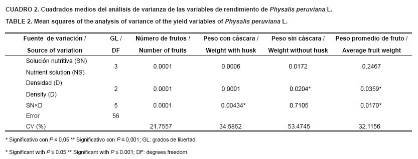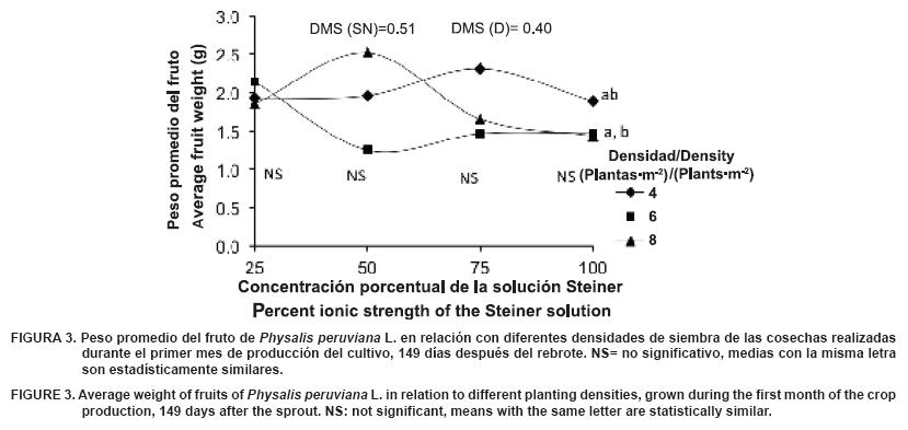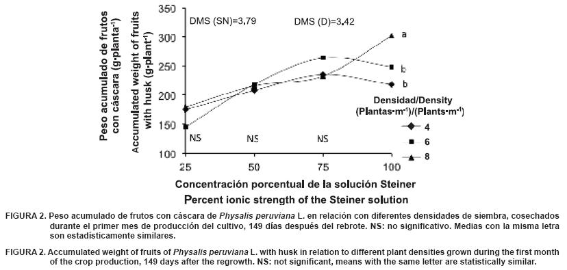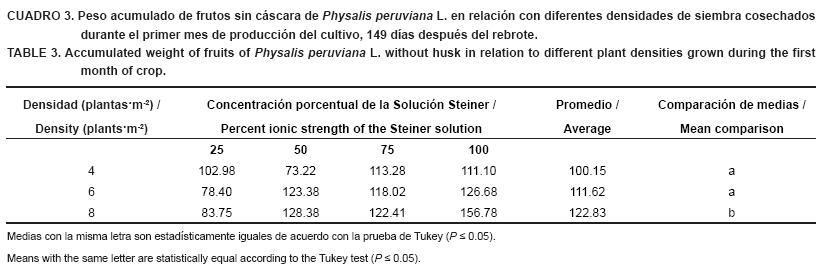 Respecto a densidad, el peso en 4 y 6 plantas·m-2 fue similar, pero diferentes al de 8 plantas·m-2. La combinación de la solución al 75 % con densidad de 4 plantas·m-2 obtuvo el mayor peso acumulado de frutos sin cáscara, lo que posiblemente se debe a la menor competencia entre plantas, y por lo tanto un mayor tamaño de frutos. Esto contrasta con el peso de frutos con cáscara que fue mayor en la solución completa con una densidad de 8 plantas·m-2, lo cual pudo deberse al peso del cáliz del fruto, que se cosechó en diferente grado de madurez. Con el peso más bajo se encontró la producción correspondiente a la solución al 25 % en combinación con las tres densidades evaluadas (Cuadro 3).