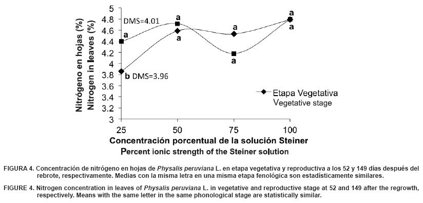 En cuanto a concentración de N en hojas de uchuva, sólo se encontraron diferencias significativas en etapa vegetativa del cultivo. Se observó que conforme aumenta la concentración de la solución, la concentración de N es mayor en las hojas del cultivo. Las muestras obtenidas del tratamiento correspondiente a la solución Steiner completa (100 %) tuvieron una mayor concentración de N en comparación con el resto de los tratamientos (Figura 4).