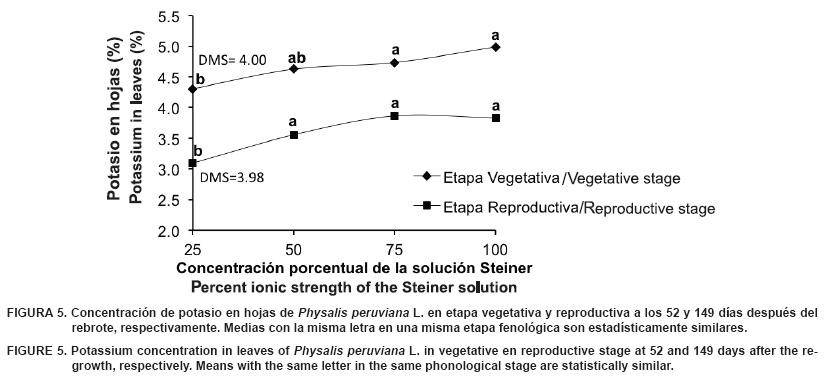 La concentración de K en hojas de uchuva obtenidas tanto en la etapa vegetativa como en etapa reproductiva del cultivo mostraron diferencias significativas (P ≤ 0.05) por efecto de la solución nutritiva. En ambas etapas del cultivo (Figura 5) los tratamientos de la solución completa tuvieron la más alta concentración de K en las hojas. Esto coincide con Castro et al. (2000) y Alcántar et al. (2009), quienes mencionan que conforme existe una mayor disponibilidad de nutrientes hay una mayor asimilación por la planta.