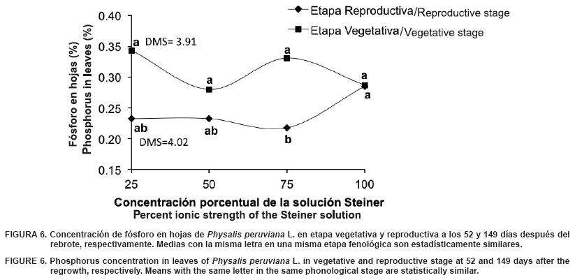 La concentración de P en hojas de uchuva fue mayor en los muestreos obtenidos en etapa vegetativa que en la reproductiva, debido a que en los primeros estadios del cultivo se acumulan nutrimentos en las partes vegetativas, y a medida que aumenta el ciclo del cultivo, estos tienden a ser destinados a las partes reproductivas para promover el desarrollo de flores y frutos (Paytas et al., 2004).