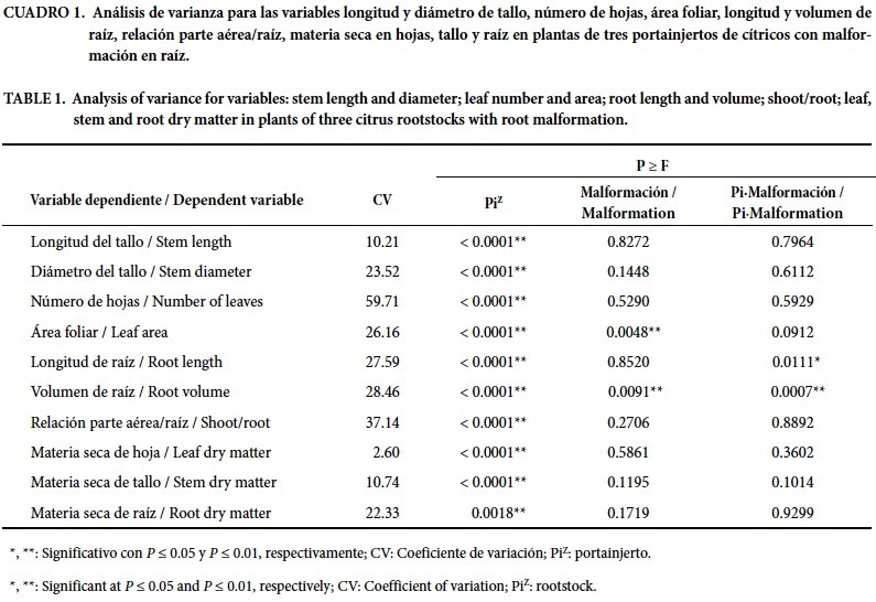 No se encontró interacción significativa entre portainjertos y malformación en raíz para longitud y diámetro de tallo (Cuadro 1). Se encontraron diferencias significativas entre portainjertos para esas variables, donde Limón 'Volkameriano' fue superior a Citrumelo 'Swingle' y Citrange 'Carrizo' (Cuadro 2). No hubo diferencia por malformación en raíz para número de hojas, longitud y diámetro de tallo, pero si para área foliar (Cuadro 1).
