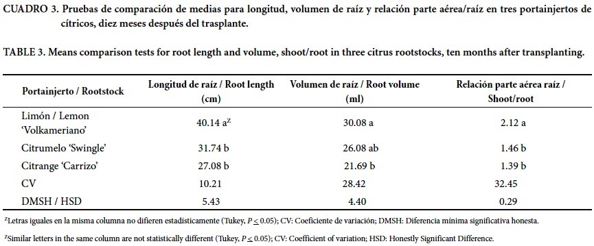 La mayor longitud de raíz de Limón 'Volkameriano' coincide con lo indicado por Girardi et al. (2007), quienes reportaron que los portainjertos más vigorosos presentan mayor desarrollo radical, producto del equilibrio entre el desarrollo de la raíz y la parte aérea (Hsiao, 2000). El vigor del portainjerto es importante porque en el caso de Limón 'Volkameriano' permanece menos tiempo en vivero para ser injertado, mientras que Citrumelo 'Swingle' y Citrange 'Carrizo' requieren de mayor tiempo para alcanzar el diámetro para ser injertados.
