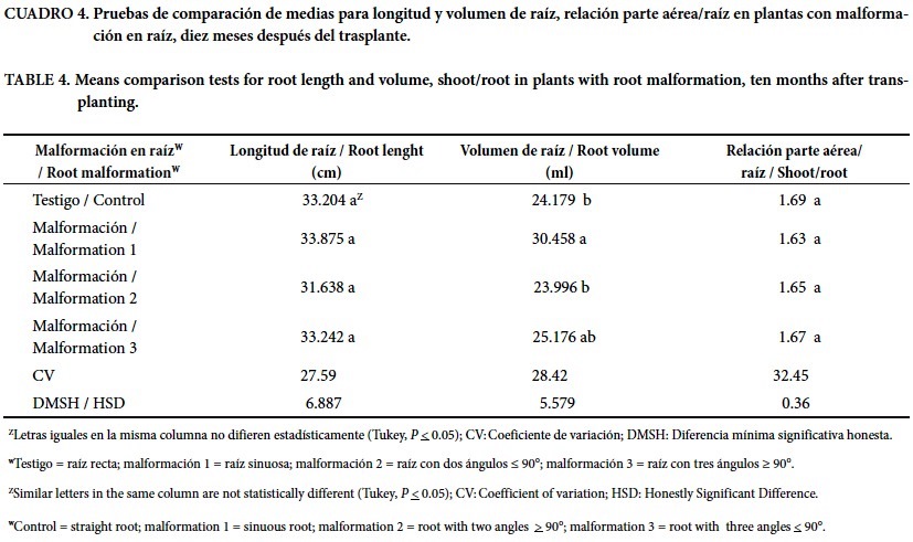 La malformación en raíz no afectó su longitud, pero sí su volumen. La falta de diferencias estadísticas entre los tipos de malformación (M1, M2 y M3) para longitud de raíz puede deberse a que el tiempo de evaluación de la variable fue corto y no permitió que se manifestara el efecto. La M1 (sinuosa) presentó mayor volumen, debido a diferentes proporciones de raíz principal y raíces secundarias. Se conoce que el desarrollo de la raíz es importante porque de esta estructura depende la absorción de agua y nutrimentos para los procesos fisiológicos. Se ha observado que en algunas especies es común encontrar variación en la asignación de recursos en función de las necesidades de las plantas (Fassio et al., 2009; Córdoba-Rodríguez et al., 2011).