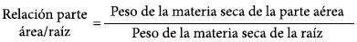La planta se disectó en hojas, tallo y raíz, que se colocaron en bolsas de papel de estraza con perforaciones y se pusieron en estufa con circulación de aire forzado a temperatura de 70° C por 72 h. Después, se evaluó el peso de materia seca. Con estos datos se obtuvo la relación de peso de materia seca, parte aérea/raíz mediante la siguiente ecuación:
