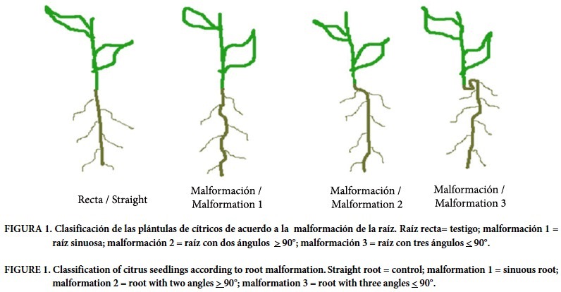 La clasificación de la malformación de raíz se hizo de la siguiente forma: Testigo, corresponde a las plantas con raíz recta; malformación 1 (M1), plantas con raíz sinuosa; malformación 2 (M2), la raíz presenta dos ángulos > 90°, y malformación 3 (M3), la raíz presenta tres ángulos ≤ 90° (Figura 1).
