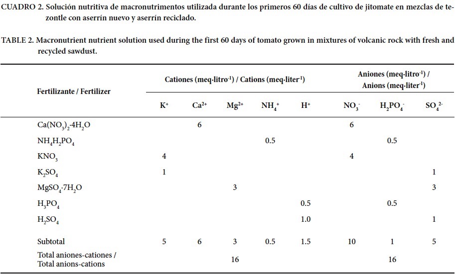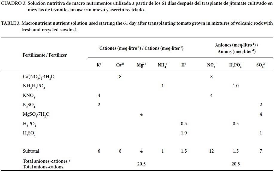 Las soluciones nutritivas se prepararon de acuerdo con los requerimientos medios del cultivo reportados por Urrestarazu (2004) y Steiner (1984). La primera (Cuadro 2) se aplicó durante los primeros 60 ddt, y la segunda (Cuadro 3), a partir del día 61 ddt hasta los 136 ddt (cuando finalizó el experimento). La concentración (mg·litro-1) de micro nutrimentos en la solución nutritiva utilizada durante todo el ciclo de cultivo fue la siguiente: Fe, 3; Mn, 0.5; Cu, 0.1; Zn, 0.1; B, 0.6.