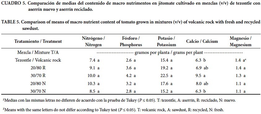 La extracción de macronutrimentos en orden decreciente fue: K > N > Ca > P > Mg (Cuadro 5). Las comparaciones de medias del contenido de N, P, K y Mg no presentaron diferencias significativas debido a efecto de tratamientos, salvo en el caso del Ca, el cual presentó los valores mayores de extracción nutrimental en la mezcla tezontle/aserrín reciclado (30:70, v/v) y los valores menores en tezontle y mezcla tezontle/aserrín nuevo (30/70), como se observa en el Cuadro 5.