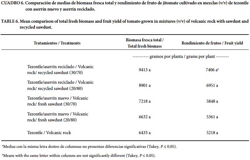 En las variables peso de fruto y biomasa fresca total no hubo diferencias significativas en la prueba de comparación de medias (Cuadro 6), pero las mezclas 30/70 y 20/80 presentaron el valor numérico mayor de rendimiento de fruto. Esto tiene relación con los valores más altos en la absorción de nutrimentos de la solución nutritiva, lo que se atribuye al mejor balance en las características físicas de la mezcla (Cuadro 1). Estos resultados son superiores a los obtenidos por Ortega et al. (2010) de 4 kg por planta en tratamientos con mezclas de aserrín y composta, lo que podría atribuirse al mayor contenido nutrimental aportado por la solución nutritiva. Aunque es necesario tener en cuenta que un medio de cultivo puede dar resultados distintos según el tipo, forma y tamaño del contenedor, especie vegetal, manejo o condiciones climáticas (Burés, 1997). En el presente trabajo de investigación la única diferencia en manejo que se tuvo fue la mezcla de sustrato, lo que destaca la importancia que tiene el medio de crecimiento para garantizar el éxito de un cultivo.
