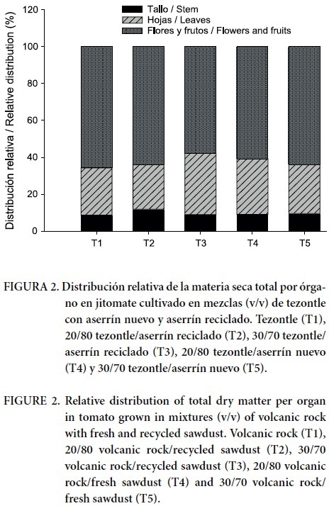 La mayor acumulación de materia seca la presentaron el tallo y las hojas; posteriormente inició una acumulación dominante en flores y frutos, que representó en todos los tratamientos más de 60%, un 30% para el caso de hoja y menos de 10% para tallo (Figura 2).