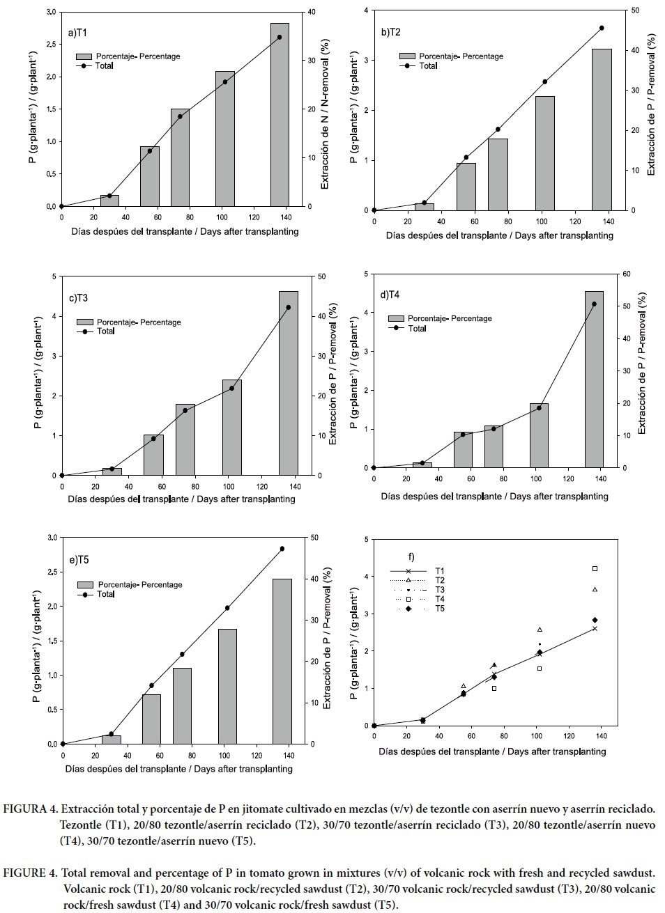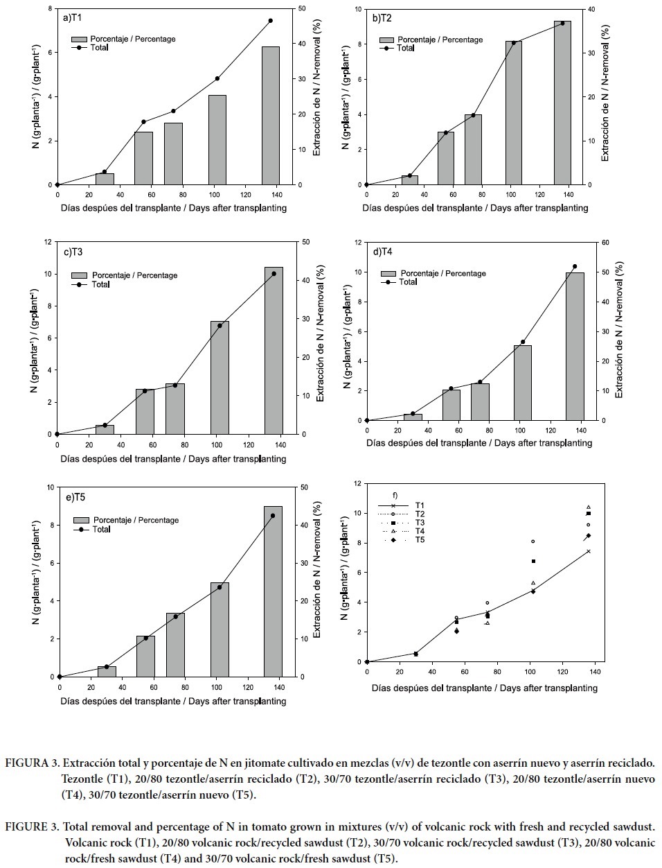 En la Figura 3 se presenta la dinámica de extracción de N en los distintos tratamientos. Se observa que la curva de extracción de este nutrimento tuvo una tendencia similar en todos los tratamientos hasta los 60 ddt, manteniéndose un incremento constante. En el periodo comprendido entre los 61 y los 136 ddt se presentó un comportamiento diferencial (Figura 3f) lo cual indica que las plantas con mayor recuperación de N crecieron en las mezclas (v/v) 20/80 y 30/70 de tezontle/aserrín reciclado y la mezcla 20/80 de tezontle/aserrín nuevo. Se observa (Figura 3f) una baja demanda de N en los primeros 60 ddt que corresponden a la etapa vegetativa, ya que durante los 61 a 136 ddt se extrajo más de 70 % del N total demandado por la planta. Este período correspondió al crecimiento y desarrollo simultáneo de follaje, inflorescencias y frutos, cuando las exigencias de N son altas (Nuez, 1995). Este comportamiento coincide con lo indicado por Pineda et al. (2011), quienes reportan una baja demanda nutrimental en jitomate durante los primeros 40 ddt, lo que resulta en una pérdida importante de nutrimentos por lixiviación. Pero después de esta fecha las plantas recuperaron más del 90% del N suministrado con la solución nutritiva. Aunque no existieron diferencias significativas, en general la extracción de nitrógeno presentó valores numéricos mayores en las mezclas de tezontle con aserrín reciclado, mientras que los valores menores se observaron consistentemente en el tratamiento con tezontle y las mezclas tezontle/aserrín nuevo (Cuadro 5).