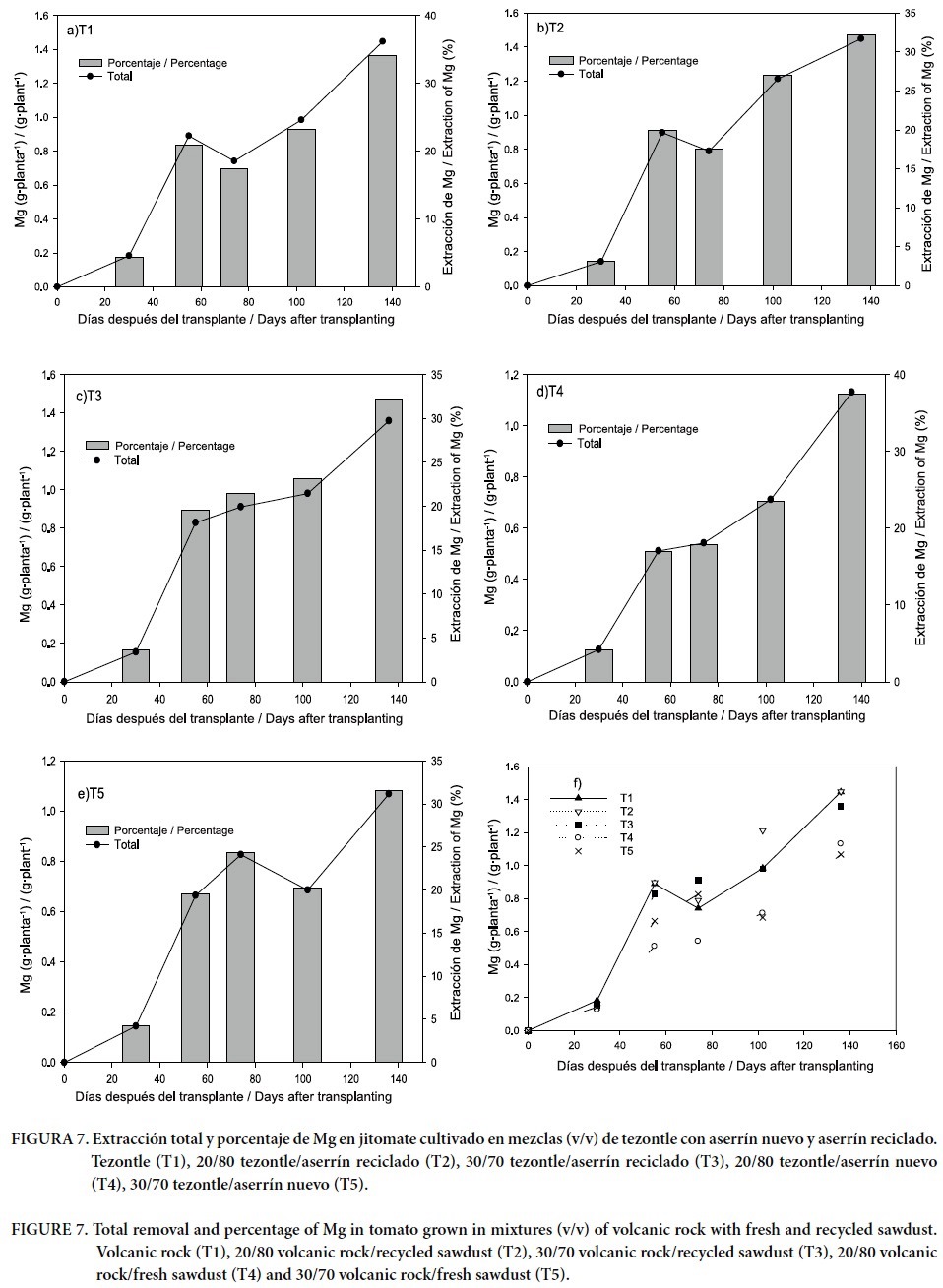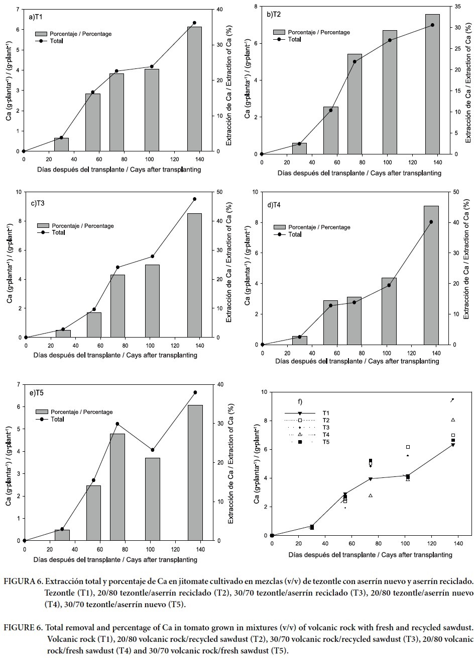 En la Figura 6 se presenta la dinámica de extracción de Ca, que en general fue similar en todos los tratamientos hasta los 60 ddt, pero de 61 a 136 ddt se observó una tendencia diferencial (Figura 6f), donde los tratamientos con mayor eficiencia en recuperación de Ca fueron las mezclas 20/80 y 30/70 de tezontle/aserrín reciclado. Este comportamiento es similar al de N, P y K, lo que sugiere una mayor disponibilidad de nutrimentos en estas mezclas. Lo contrario sucedió en los tratamientos de tezontle y la mezcla 30/70 tezontle/aserrín, que presentaron los valores más bajos. En el incremento del contenido total de Ca a través del tiempo, se observa que del 61 a los 136 ddt se acumuló más de 80 % del Ca demandado por la planta, lo cual coincidió con la floración, crecimiento, desarrollo y cosecha de frutos. Estos resultados describen el comportamiento normal del Ca en la mayoría de las plantas: se observan bajos requerimientos en la etapa inicial, pero a medida que la planta se desarrolla la demanda es mayor, y se alcanzan las concentraciones más altas al final del ciclo de cultivo (Marschner, 2012; Barker y Pilbeam, 2007). Es importante notar que, contrario a lo observado en los demás nutrimentos (N, P, K, Mg), para el caso del Ca sí se presentaron diferencias significativas entre tratamientos. La mayor eficiencia en la extracción de Ca se observa en la mezcla 30/70 de tezontle/aserrín reciclado, y las menores, en tezontle y mezcla 30/70 de tezontle/aserrín nuevo. Esta situación corresponde con el mayor espacio poroso total y capacidad de retención de humedad en la mezcla 70/30 tezontle/aserrín reciclado, y contrasta con los valores menores de dichas características en tezontle y mezcla 70/30 de tezontle/aserrín nuevo (Cuadro 1). Al respecto, Morard et al. (2000) indican que cuando la disponibilidad de humedad es adecuada y la concentración de calcio en la solución nutritiva es alta (> 5 mM), la absorción se da por un proceso pasivo acoplado a la absorción de agua durante el día y presión de raíz durante la noche.