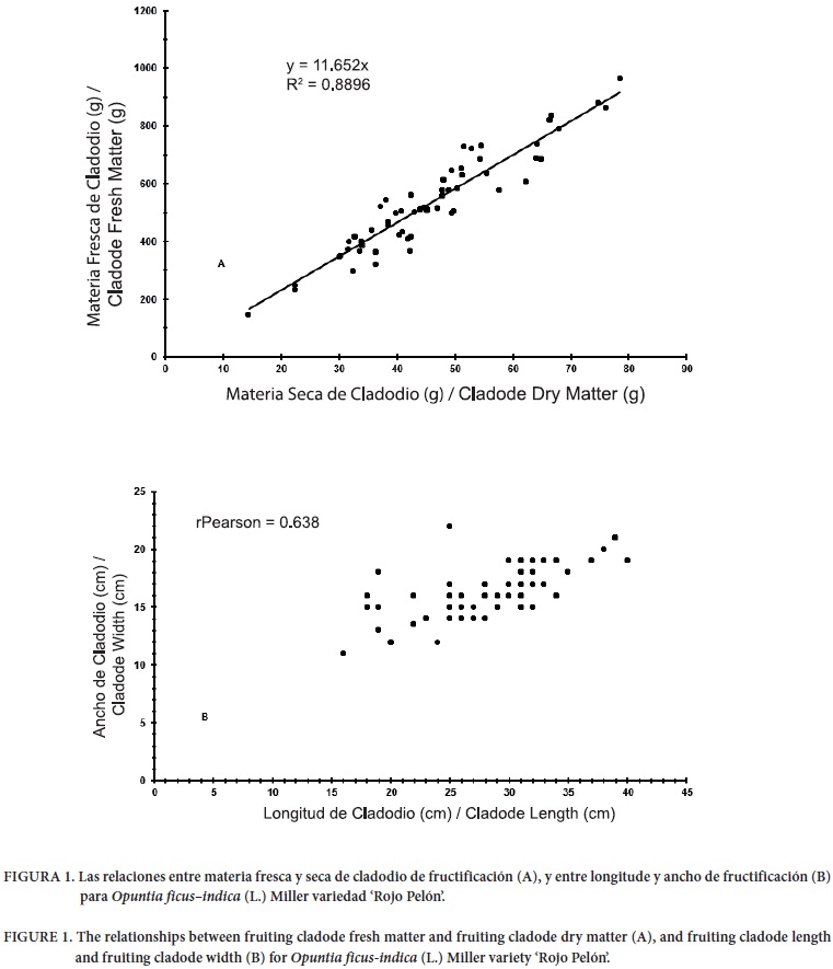 Se tuvo especial cuidado de elegir un cladodio de cada punto cardinal de la planta (norte, sur, este y oeste) asociado a cada número de frutos; asimismo, la mayoría de frutos mostraran cambio de color en su cáscara. Por lo anterior, un total de 480 frutos fueron cosechados y pesados. En cada uno de los 60 cladodios desprendidos se midió la longitud y el ancho, luego se limpiaron con agua destilada y fueron inmediatamente pesados. Esas actividades fueron realizadas los días 9 y 10 de agosto de 2012. Después, los cladodios fueron cortados en rebanadas y deshidratados hasta peso seco constante en estufa a 75 °C durante 36 horas; luego sus pesos fueron registrados. Merece ser señalado que en nuestro trabajo previo (Valdez-Cepeda et al., 2013), las materias fresca y seca de los cladodios de fructificación fueron involucradas como variables independientes.