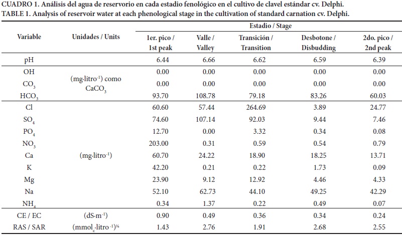 En el Cuadro 1 se presentan los análisis de agua del reservorio muestreado en cada etapa fenológica en el cultivo de clavel estándar cv. Delphi. Esta fue la composición del agua con la que se prepararon las soluciones fertilizantes utilizadas durante el periodo de desarrollo del cultivo estudiado. La caracterización química del sustrato, del tejido vegetal y del lixiviado se realizó en los laboratorios de la Universidad Nacional de Colombia, sede Bogotá, según las metodologías propuestas por el Centro Nacional de Investigación de Café (Carrillo et al., 1994).